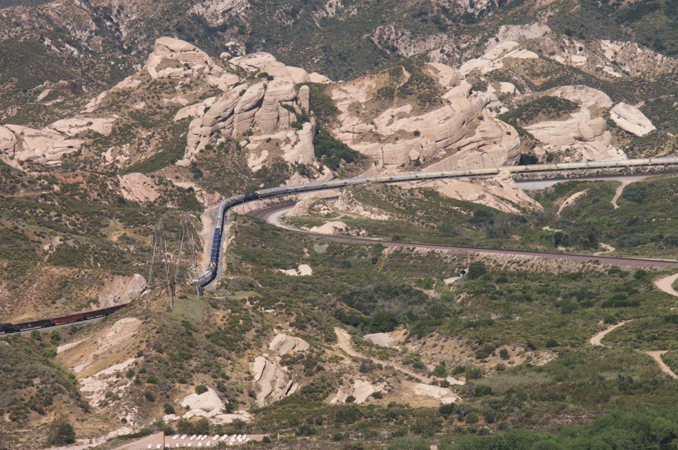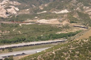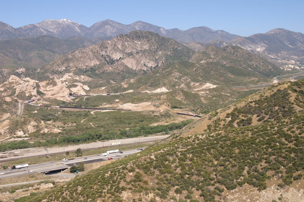 Infos Today, I spent the whole morning at this location. The result are a total of 249 photos. I made it to Overlook 1 and 2 and 3. On the aerial photo 4049, Cleghorn Road goes to the left and uphill (see map). From left: I-15, Cajon Blvd., BNSF MT-3 (3%), MT-2 & MT-1 (2,2%) going to Sullivans Curve. |