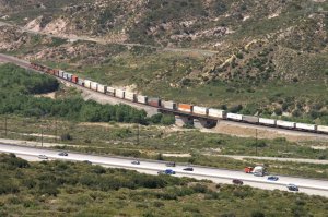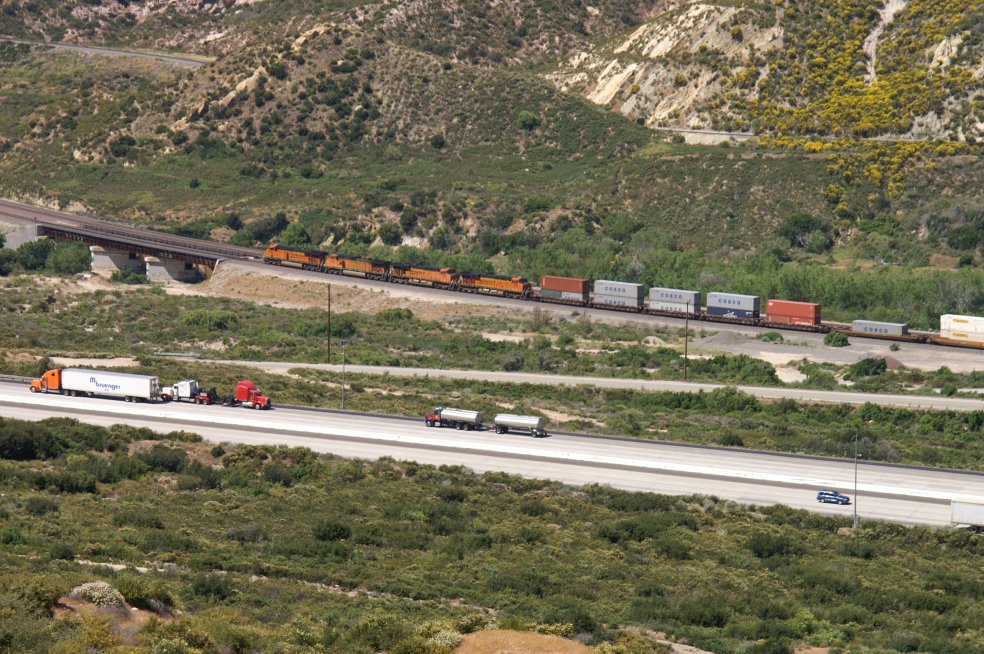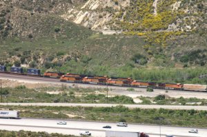 | Train 3 BNSF EB with 3 locos - 1634 | - 1635 | Train 3 going uphill and a Pepsi Truck on I-15 - 1637 |