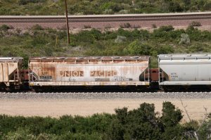 | After train 14 was gone, and train 11 was still sitting in the siding, I decided to drive down from my overlook. On the way down, I took photo 2014 before I was on track level. Once I reached the "parked" UP train, I was able to take some detail photos of the different DBS cars. | ||