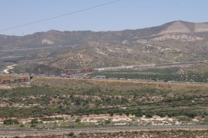 | Let's make a tour as seen from this higher overlook 2: 1658 = view toward Swarthout Canyon Curve. We are looking South. From left to right: I-15, Route 66, BNSF MT-3, MT-2, MT-2 and UPT. 1659 = looking South-West. 1660 = we are looking more or less 90 degree to I-15 and it is almost West. 1661 = Cleghorn Exit and Sullivans Curve in the distance. 1662 = Sullivans Curve in the middle. 1663 = looking North-West with Mormon Rocks and Highway 138. We have the Hill at right blocking our view. But this power line road was closed with a big gate and therefore, no access to the top of it. | ||