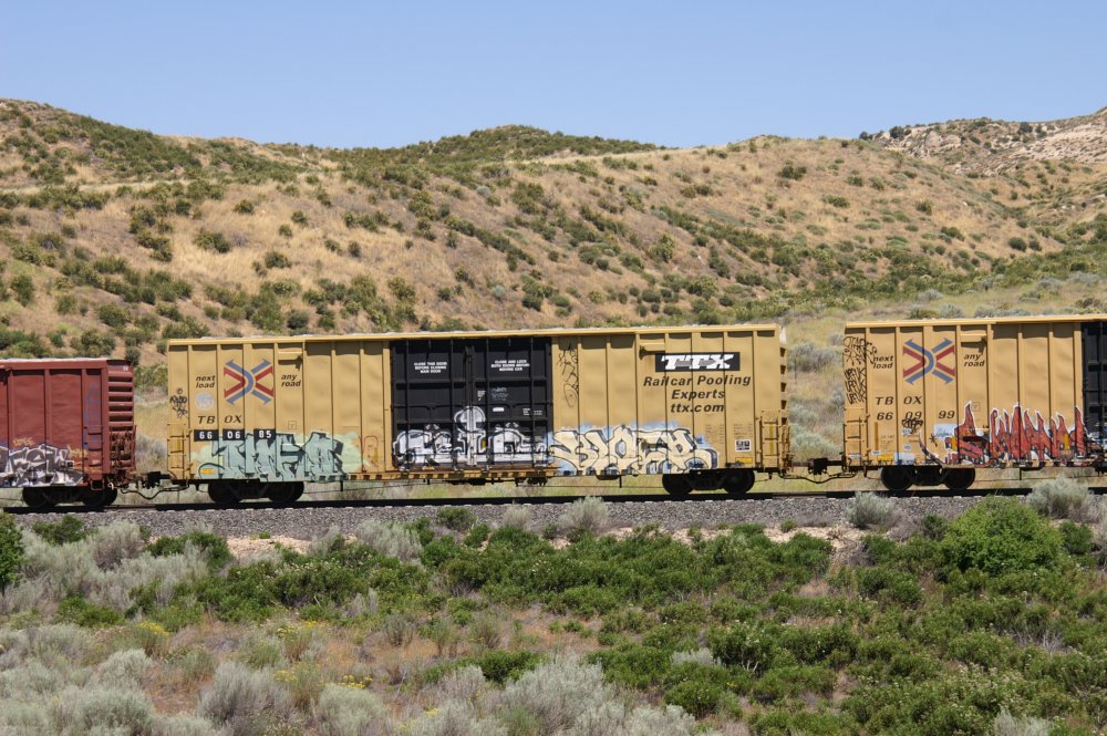 | After the Amtrak train passed, I wanted to continue my journey upbill. But a freight train came and I decided to drive down Swarthout Canyon Road. Once again, I was too late and the UP locos made it already round the curve to SWC. Anyway, I was able to shoot some freight cars. | ||