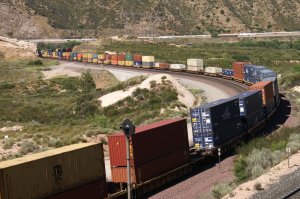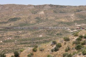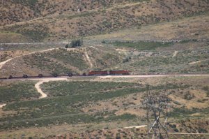 | I was hoping to get a UP train on the Colton-Palmdale Cutoff and finally at 17.09, I can see the locos of a SB coming round the corner in the distance. | ||