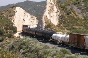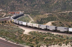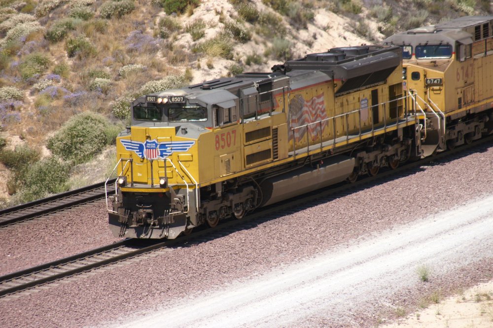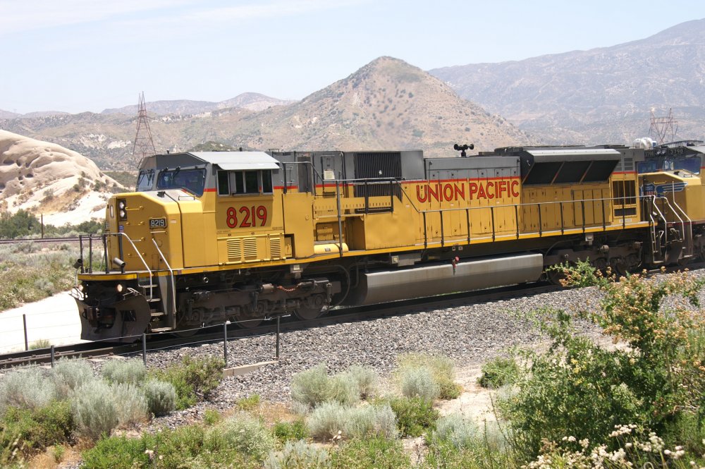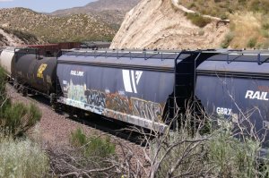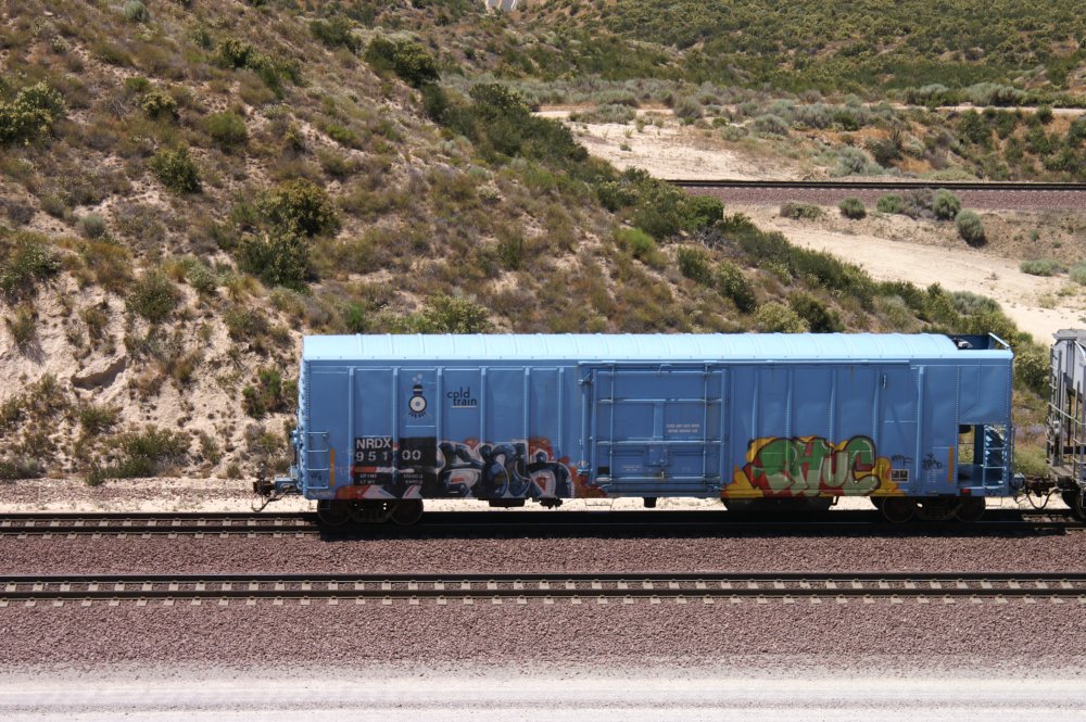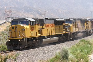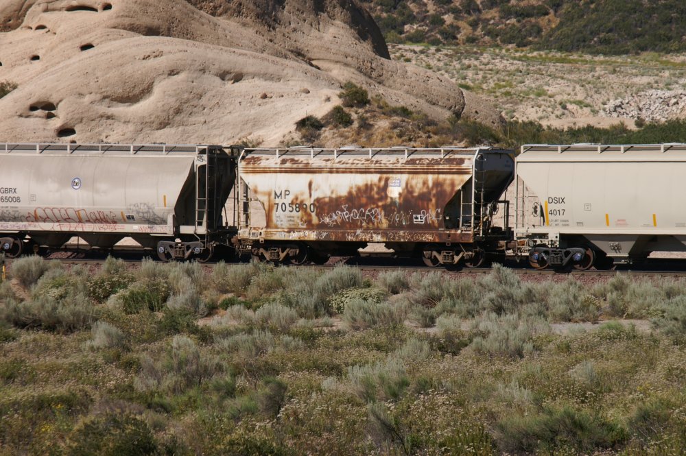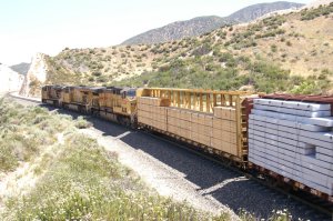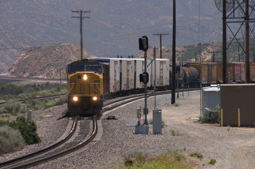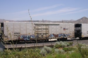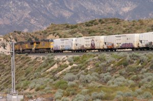 | Now we got a UP SB (Train 6) on the Colton-Palmdale Cutoff at 08.12 h with reefers, other mixed cars and lots of graffiti. | |||