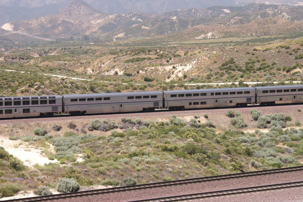 | As the train was slowing down (after photo 40179), I took my van and drove to the other side of Highway 138 and stopped on USFS road 2N89. Photo 40180 is already taken from there. Soon after, the train was picking up speed. Once again, I took 3 photos of the famous Mormon Rocks along Highway 138. | |||