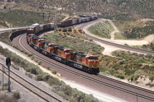 | BNSF EB Train 2 in the distance (10.19 h) - 31126 | I can already see some Werner Trailers - 31128 | this train is on BNSF MT-3 (3 % grade) - 31129 | |