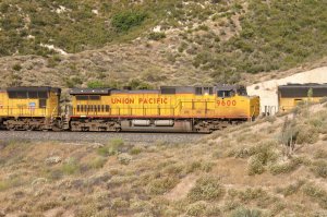 | Who did ever expect to see 2 more downhill trains at the same time? But we are having a UP SB manifest on UPT and a UP WB bare table on BNSF MT-2. Both UP trains are at Alray and are passing over Baldy Mesa Road and under I-15. (39 pics) | ||