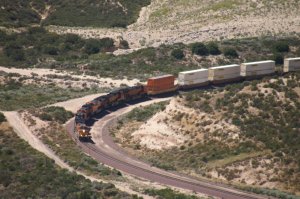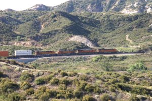 | Remember my first train of the day was pictured at Blue Cut around 06.45 h during my daily procedure driving on Route 66 uphill to Cajon. As I am currently sitting on Stein's Hill and took pictures of the BNSF Intermodal Train, I looked back and I could see the headlight of the very same (First Train of Day 9). 15 | |||