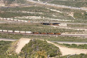 line tower. This time, I was at the right time at the right place because we have a down hill race of 2 different trains at the same time. Train 1 is a BNSF WB Intermodal on BMSF MT-2 and Train 2 is another BNSF WB Intermodal on BNSF MT-3. The only small disturbance are the power line cables. (39 pics) |