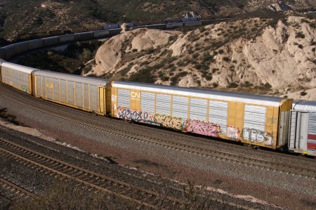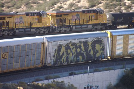 | huge graffiti on Auto Rack just below the UP locos - 12267 | - 12268 |
