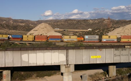 | MAERSK Containers on Well Cars - 11562 | the head end of Train 2 is passing the Mormon Rocks - 11563 |