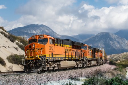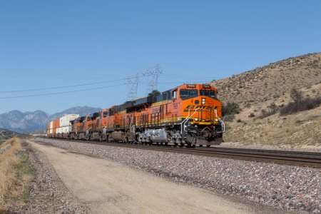 | BNSF 5606 WB on MT-2 over Cajon Creek at Mormon Rocks MD-24 | BNSF 3913 EB on MT-3 going under Hwy 138 MD-16 |