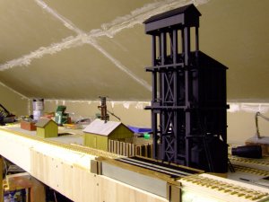 Stück der Plattform mit der Treppe vom Bahnhofsgebäude - ein Toilettengebäude, kitbashed aus einem Gebäude der Outhouse-Collection von The Building and Structure - das Halbreflief Warehouse, komplett scratchbuild, - der Baker-Watertank aus einem Banta-Bausatz - ein kleines Company Bunkhouse aus einem Bausatz von Deerfield River Laser (eigentlich ein Miner's Shack |