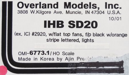 | Code US-160: HO Scale: OMI # 6773.1, IHB, EMD SD20 # 2920, F/P, lights, 10/01-run, (3/20), sFr. 400.- consignment |