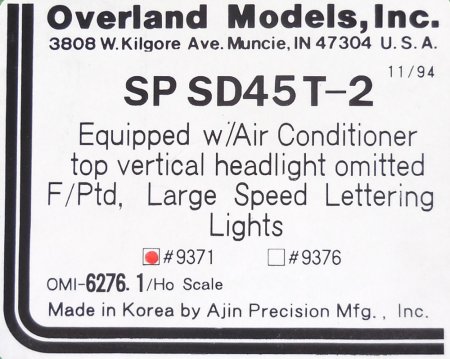 | Code GS-104: HO Scale: OMI # 6276.1, SP, SD45T-2 Speed Lettering, F/P, #9371, lights, 11/94-run, sFr. 550.- consignment |